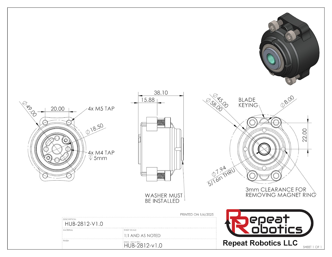 Have you been looking for an easy way to create a high power spinner on your next beetleweight? Want a mechanically robust hub motor that ties your frame rails together? Tired of worrying about belts and pulleys? The Repeat 2812 hub motor has been custom designed for the combat robotics community, with guidance from many award winning builders with 20+ years of combined hub motor experience. This motor has been tested by top bots across the US and now you can benefit from the reliability and durability of a custom hub motor for a fraction of the price!